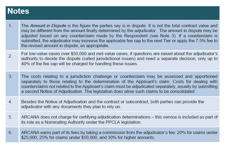 In accordance with section 13(3) of the PPCLA Regulation 23/2022 dated February 25, 2022, when making their Determination and Order regarding the cost and other charges related to the adjudication, ARCANA adjudicators shall be limited to the following: